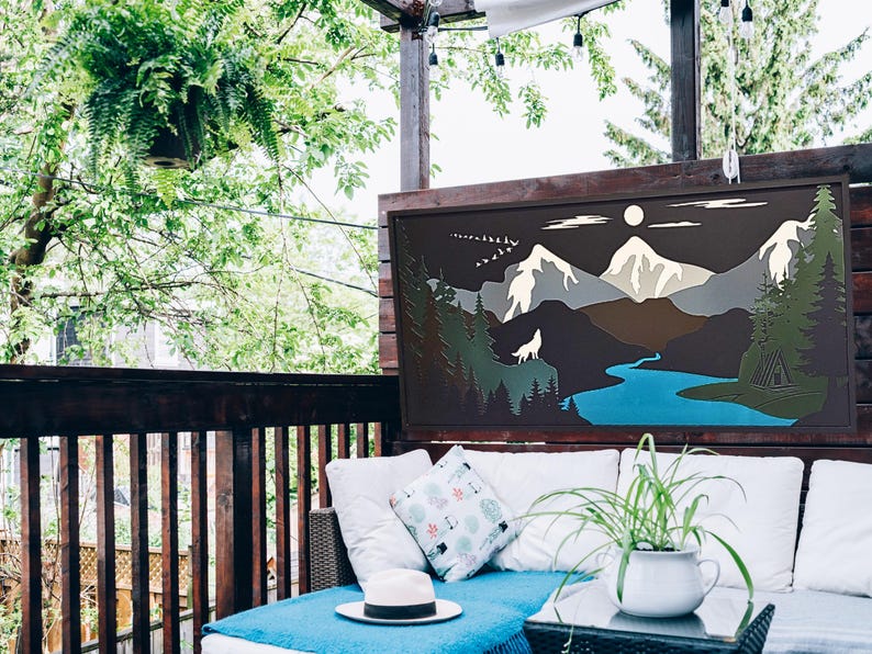 Wolf Mountain: Multi-Layer Aluminum Wall Art Bring the wild beauty of the mountains into your home or outdoor retreat. Wolf Mountain is a multi-layered aluminum wall art piece that captures the call of nature with a lone wolf howling beneath the moon, surrounded by towering pines, glacial peaks, and a winding river.