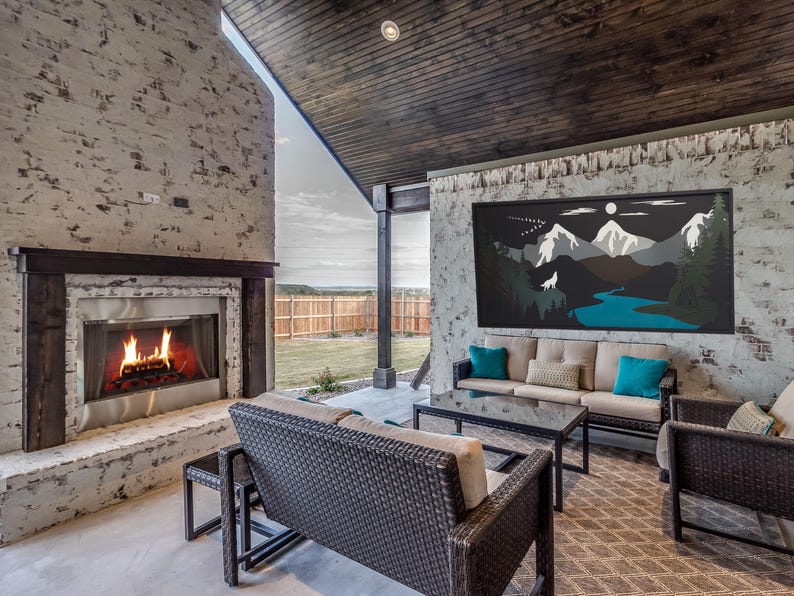 Perfect as a statement piece above a fireplace, in a sunroom, or on a covered patio, this design blends rugged artistry with modern craftsmanship.